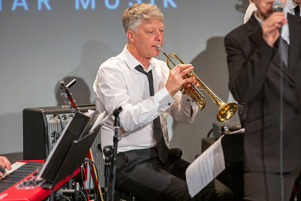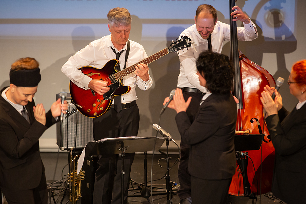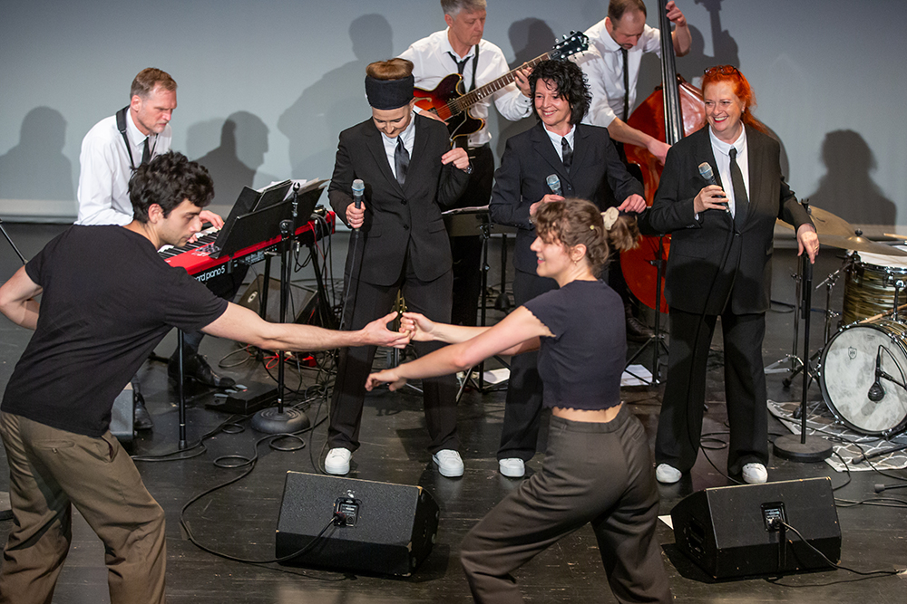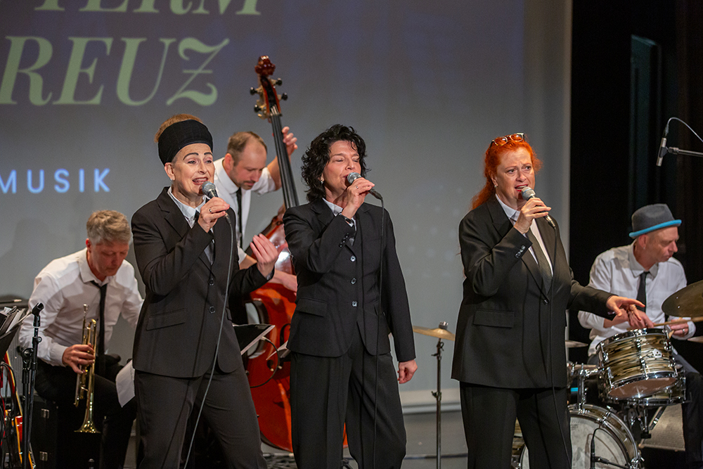 Musik: SWING TANZEN VERBOTEN: Barbara Frühwald (voc), Ute Legner (voc), Andrea Rother (voc), Daniel Mark Eberhard (p/sax/akk), Josef Holzhauser (git/trp), Johannes Ochsenbauer (b), Walter Bittner (dr)